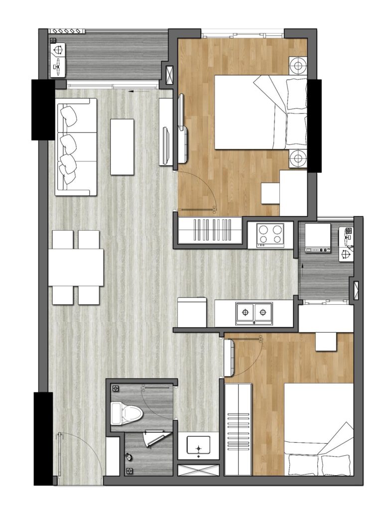 Trong thiết kế mặt bằng Căn hộ 9x Next Gen Bình Dương chúng ta có thể nhận thấy sự cân bằng diện tích giữa không gian sinh hoạt, phòng ngủ, phòng vệ sinh, lô gia và sân phơi. Đặc trưng của tất cả căn hộ 9x là khi bước vào cửa là không gian rộng rãi nơi phòng khách và nhìn ra phía ban công bên ngoài.
