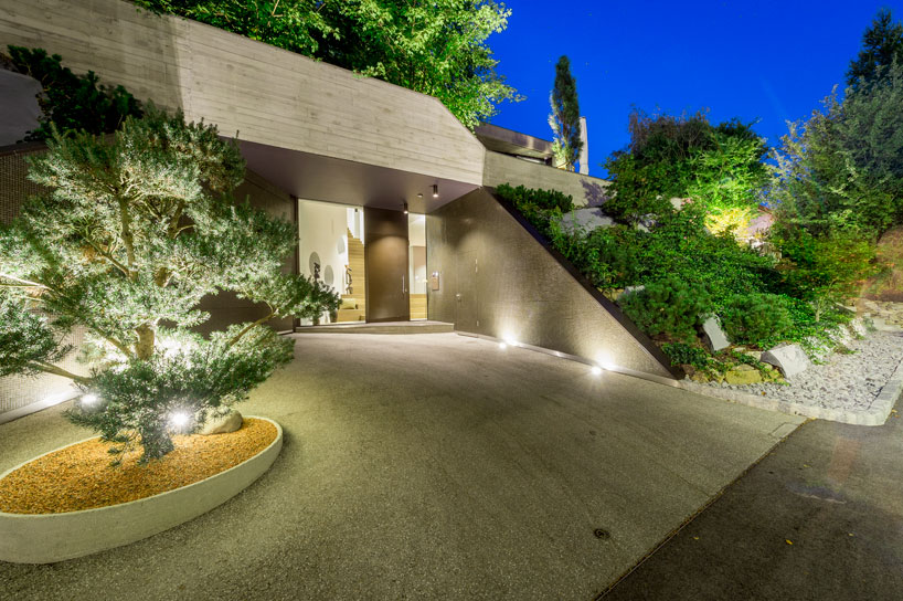 Là tác phẩm của công ty kiến trúc Caramel Architects, ngôi nhà này có phần mái bê tông cỡ lớn và móng cao hơn 6 mét so với mặt đường. Dù địa hình sườn đồi khá dốc, thiết kế hợp lí vẫn đảm bảo cho cảnh quan khu vườn bao quanh nhà kết nối dễ dàng với các khu vực sinh hoạt bên trong.