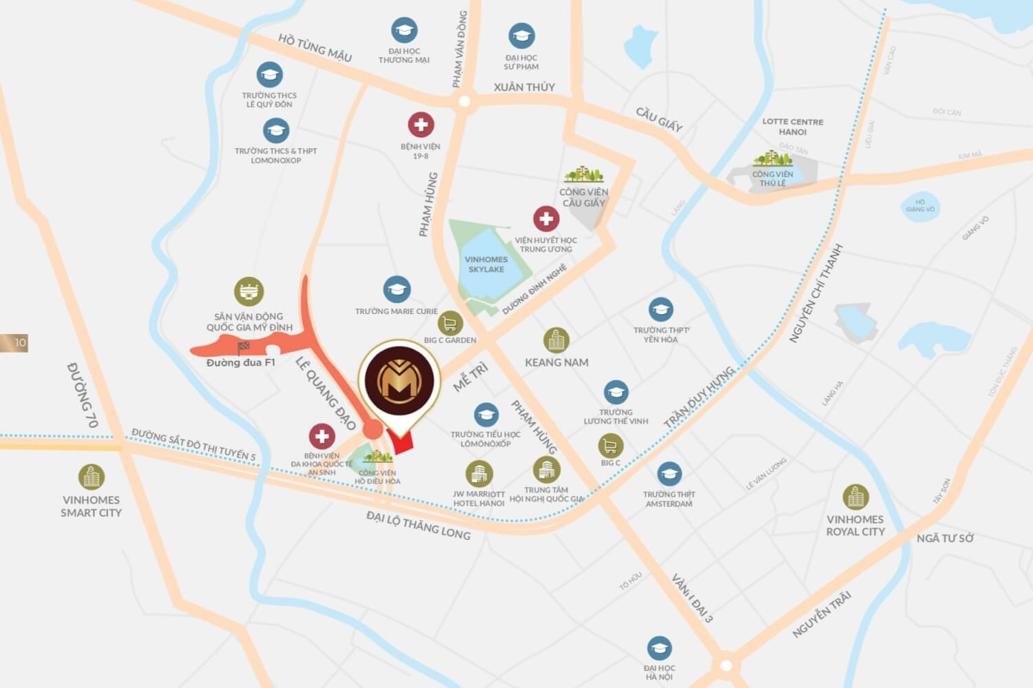 Dự án The Matrix One tọa lạc vị trí đắt giá giao giữa các tuyến đường Mễ Trì, Châu Văn Liêm, Lê Quang Đạo và Đại lộ Thăng Long. Đây là các tuyến đường huyết mạch trọng tâm cửa ngõ giao thương phía Tây thành phố, dễ dàng tiếp cận đến các tuyến đường trọng điểm khác cùng khu vực như Dương Đình Nghệ, Phạm Hùng, Hồ Tùng Mậu, đường vành đai 3,… giúp cư dân The Matrix One có thể dễ dàng di chuyển, kết nối đến bất cứ nơi đâu trong thành phố một cách nhanh chóng và dễ dàng nhất.