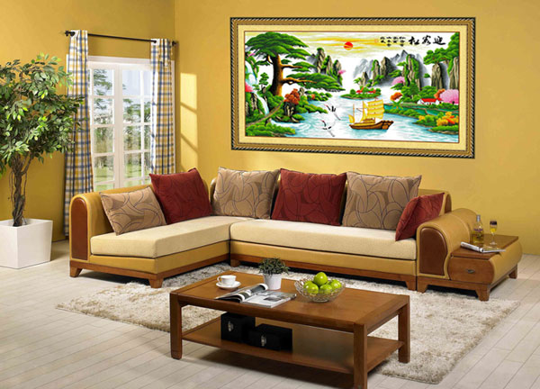 Bức tranh sơn thủy hữu tình hài hòa không chỉ làm đẹp cho văn phòng công ty mà còn có tác dụng điều hòa âm dương, chiêu tài lộc cho chủ nhân. Các nhà hàng, đại sảnh khách sạn hay văn phòng công ty vẫn thường treo bức tranh phong cảnh này. Nên chọn bức tranh có núi, có nước được vẽ kết hợp hài hòa, tránh mua những bức tranh thiếu nước mà chỉ có núi hoặc núi quá hùng vĩ trong khi nước lại vẽ sơ sài.