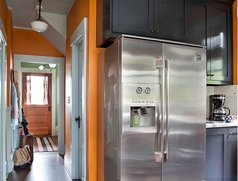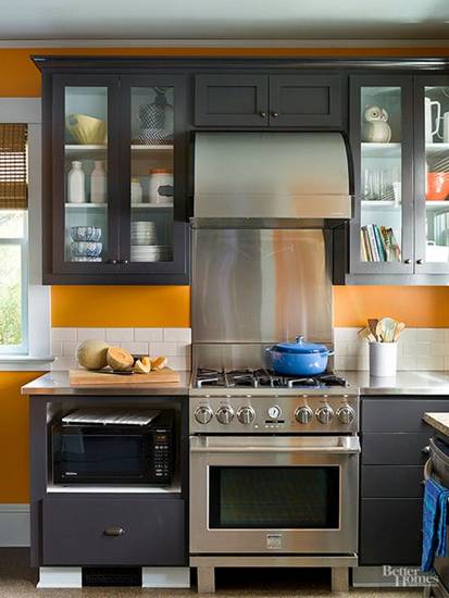 Phần kệ bếp được kết hợp cùng với các vật liệu thép không gỉ góp phần nâng tầm hiệu quả của phong cách hiện đại hơn. Tường được lát bằng gạch sáng bóng, giúp cho những tông màu đậm thêm phần nổi bật hơn. Việc sử dụng cửa kính là một cách để giúp cho phòng bếp nhỏ không còn phải đối chọi với cảm giác tù túng.