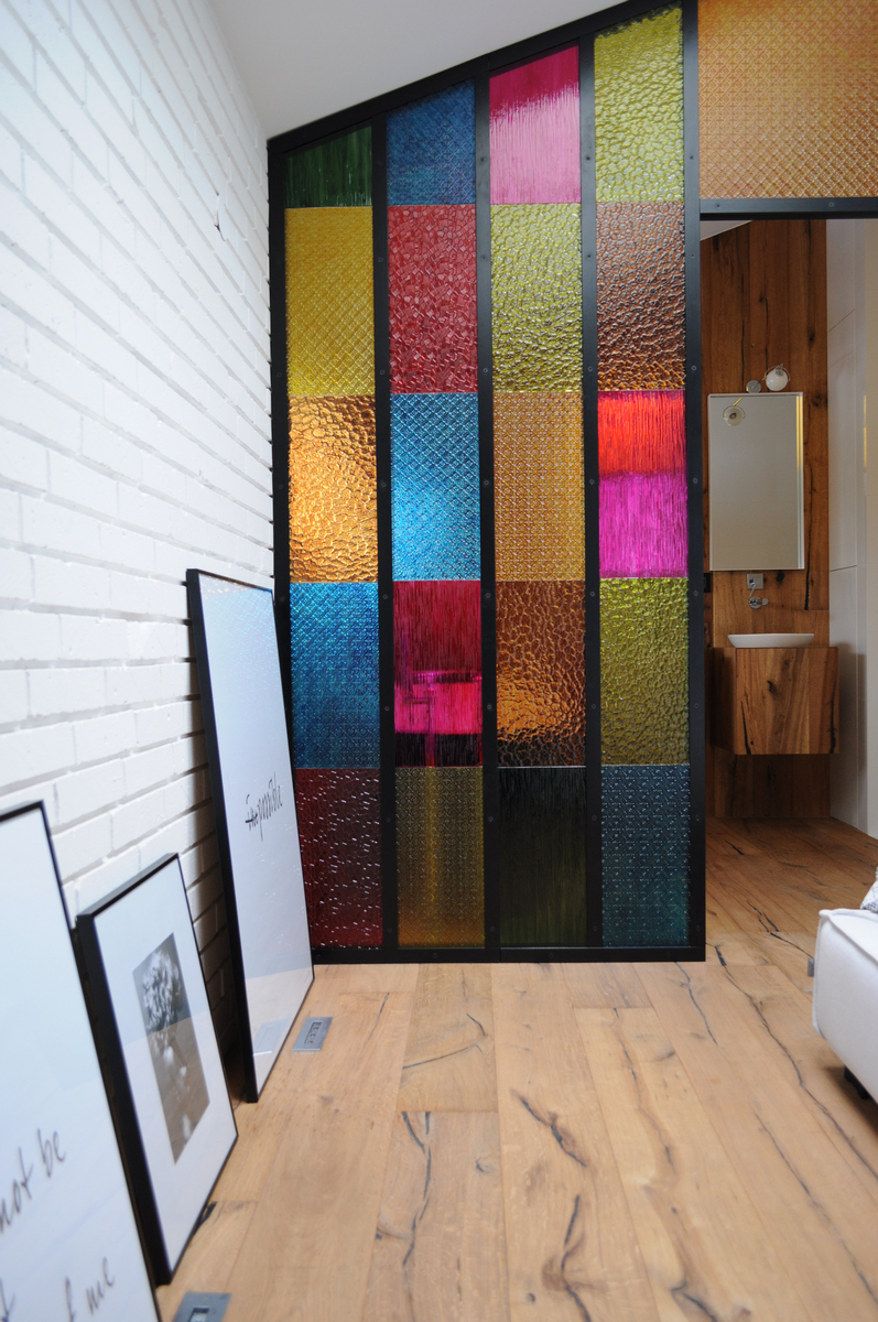 Phòng ngủ và nhà tắm ngăn cách nhau bởi một bức tường thủy tinh nhiều màu. Tuy ý