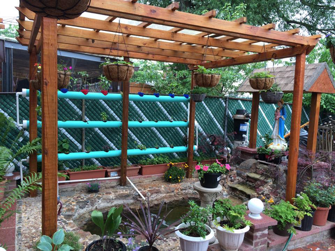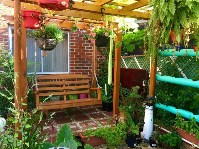 Khu vườn gồm 3 khu: Phía bên phải là căn chòi; bên trái là xích đu, giàn trồng rau và hồ cá