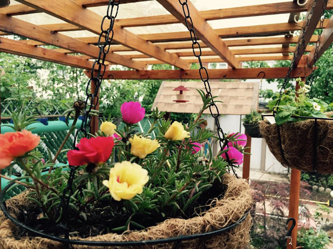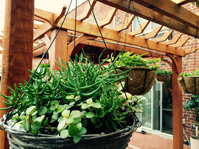 Những cây hoa, cây cảnh treo trên cao được trồng trong các chậu xơ dừa