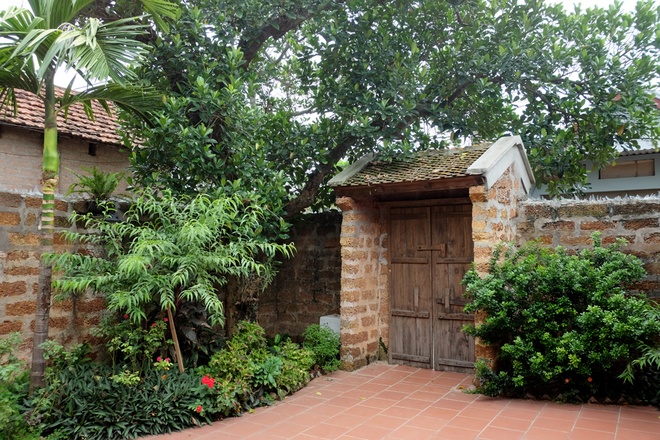 Cổng nhà được xây giống như một cổng làng thu nhỏ với mái lợp ngói có cây cổ thụ tỏa