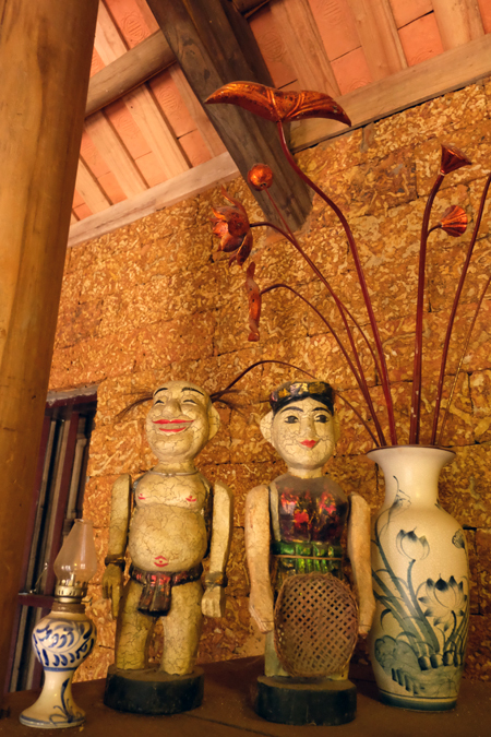 họa tiết men lam, chú Tễu trong múa rối nước, đèn dầu...