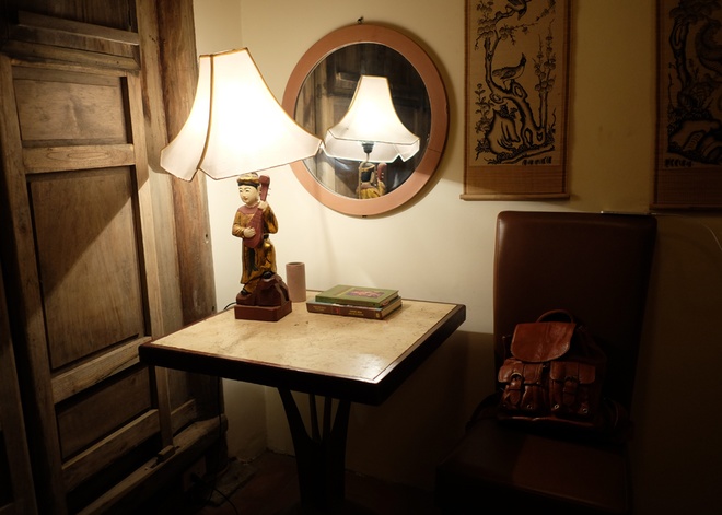 Phòng ngủ cũng có một góc bàn đọc sách nhỏ với đèn hình tố nữ đánh đàn,
