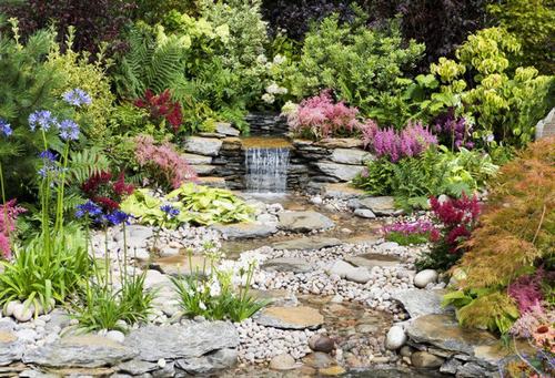 Có nhiều kiểu thác nước trang trí sân vườn thông thường được tạo thành bởi đá và sỏi