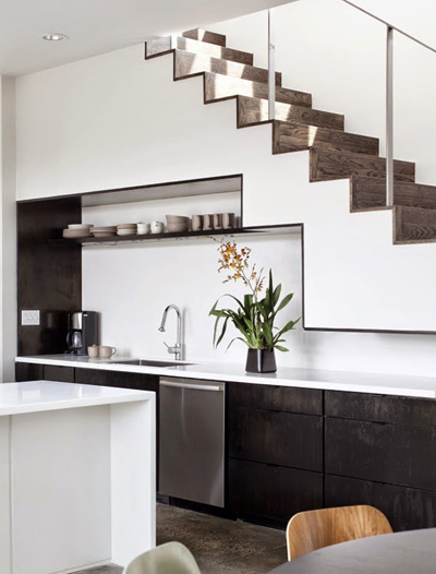 Căn bếp được thiết kế đồng bộ với cầu thang tạo thành một chỉnh thể hài hòa, đẹp mắt
