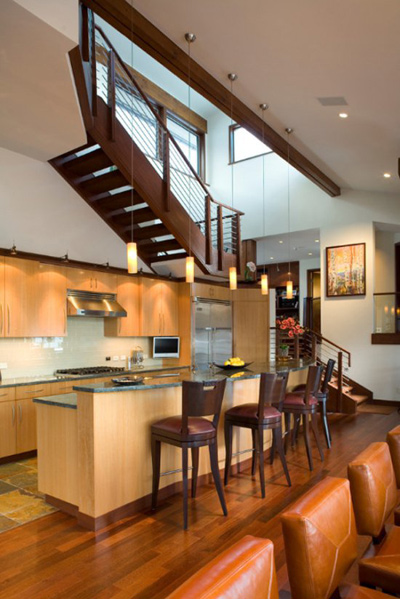 Cầu thang lên gác xép có độ dài vừa phải, vì vậy chủ nhà thoải mái sáng tạo bếp hình chữ L